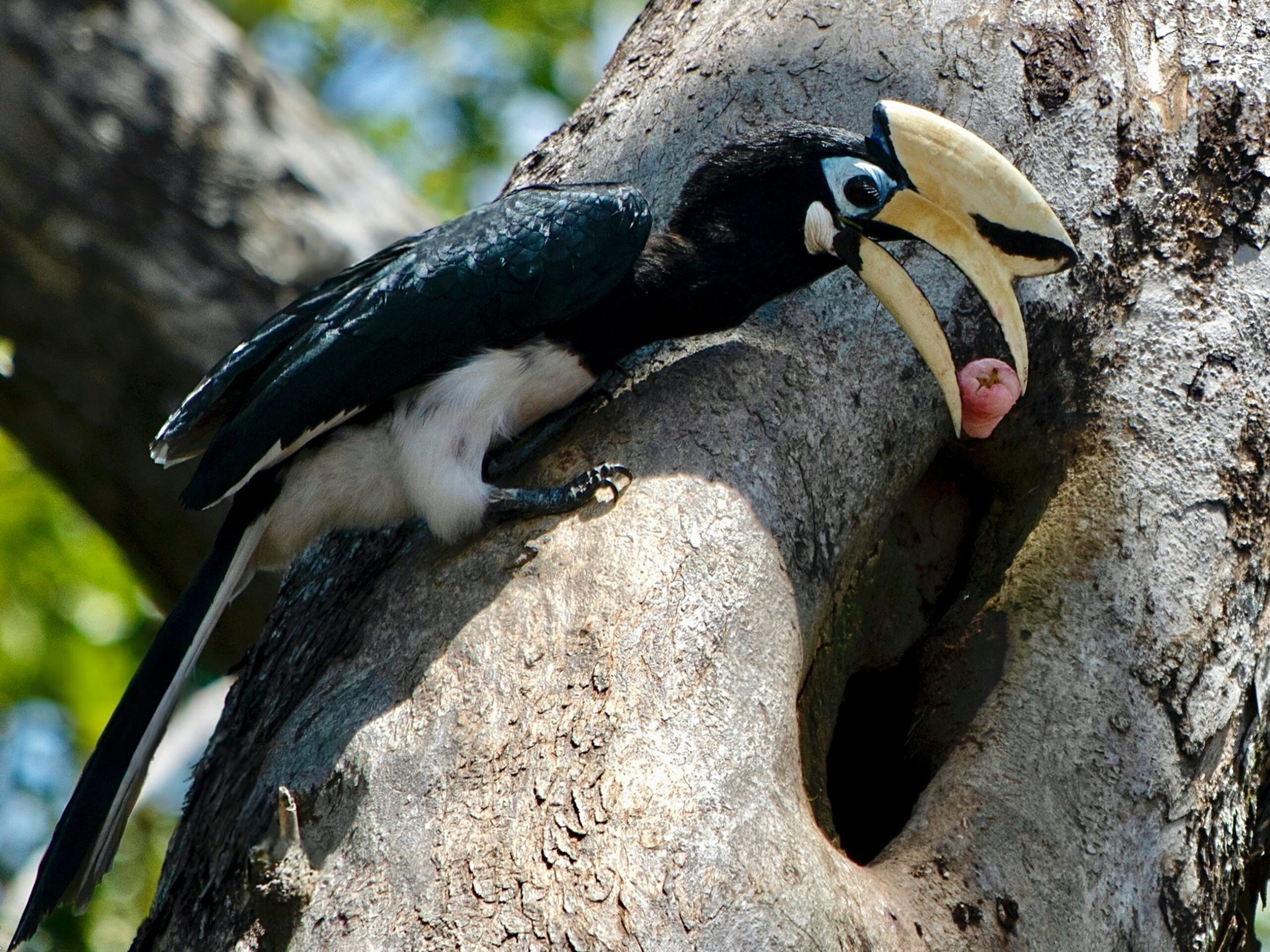 One of the most powerful examples of cooperation in nature comes from the Great Hornbill. During breeding season, the female locks herself inside a tree cavity using mud and food remains, leaving only a tiny slit open.