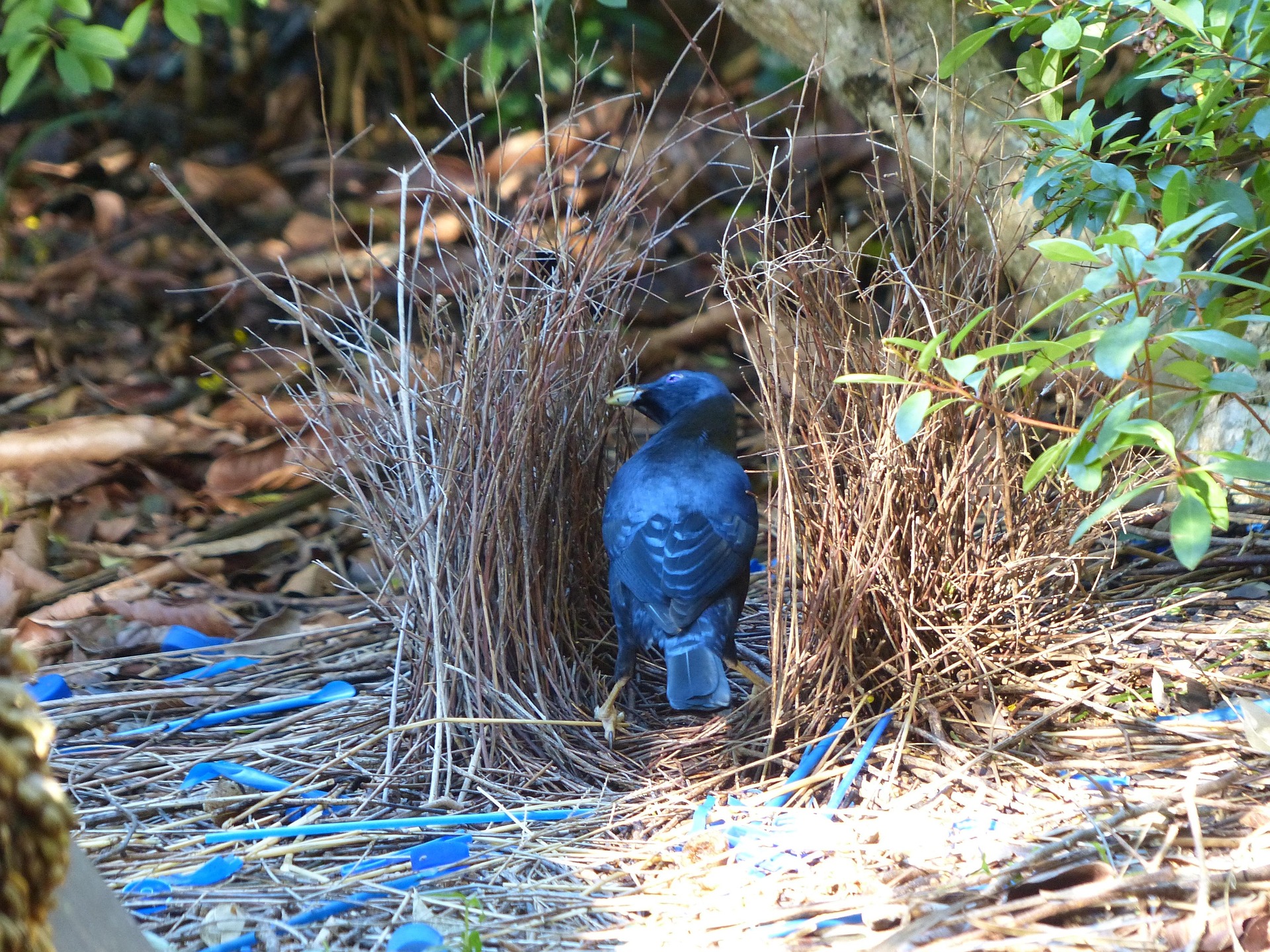 The male Satin Bowerbird invests enormous effort not in survival alone, but in courtship. He builds elaborate structures called bowers using twigs and decorates them carefully with blue objects — feathers, flowers, berries, even human-made items.